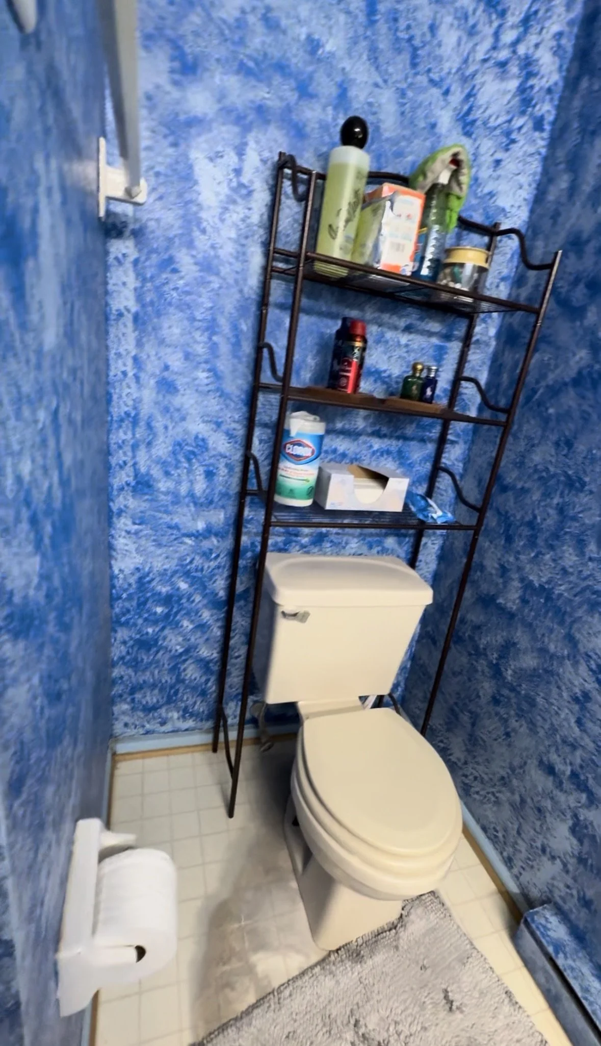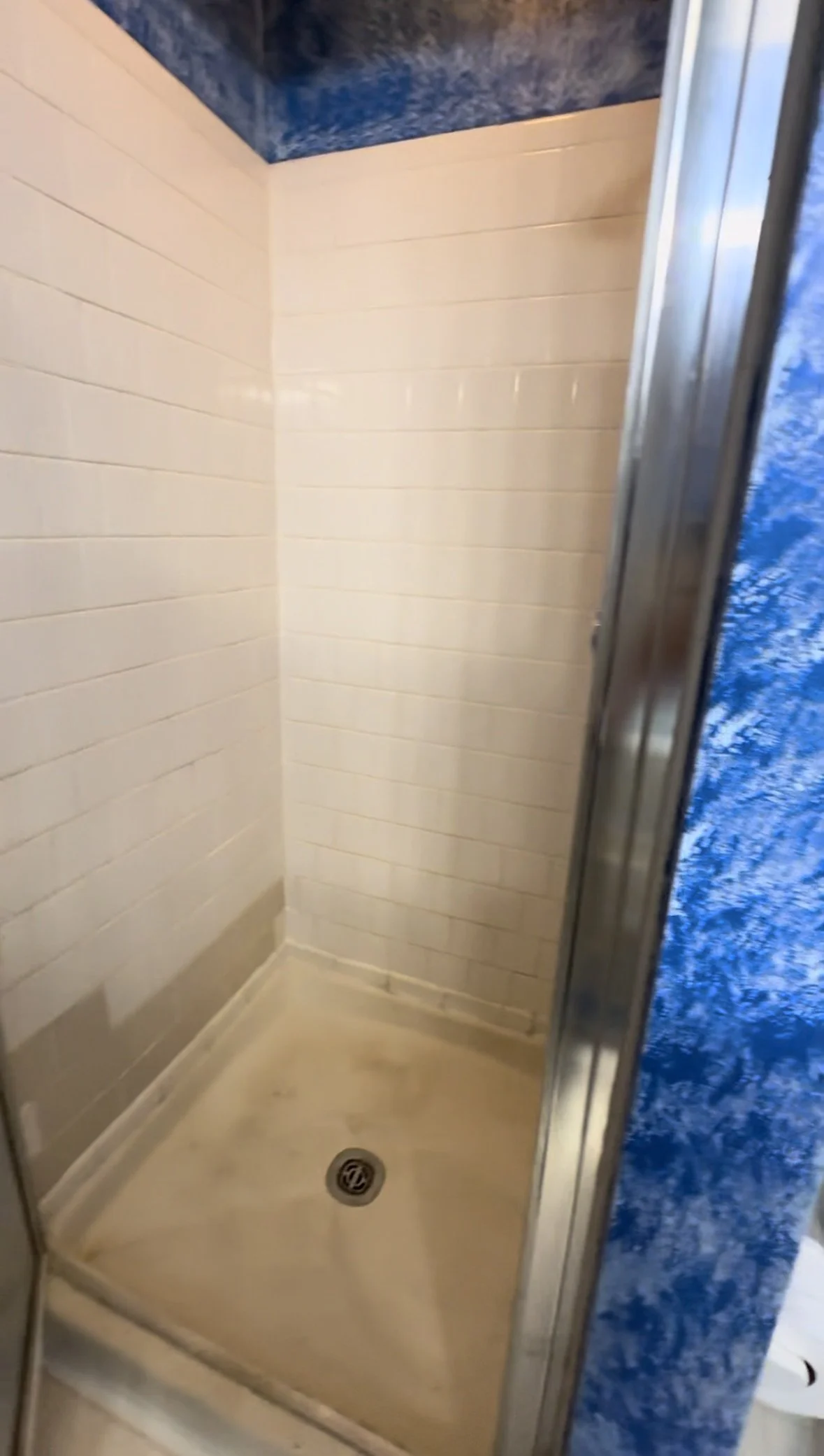 The original bathroom featured bold blue sponge-painted walls, aging fixtures, and a worn shower enclosure that made the space feel darker and more closed in. The homeowner wanted a brighter, more modern look with finishes that would hold up over time while elevating the overall feel of the room.